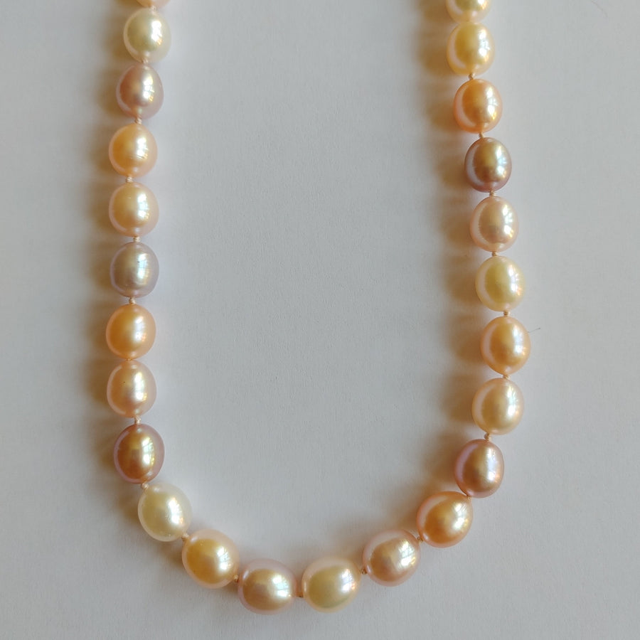 This one-of-a-kind freshwater pearl necklace consists of an alternating color pattern of white, peach and lavender pearls connected together with a sterling silver bean clasp. Delight in natural beauty and uniqueness with this exquisite piece.